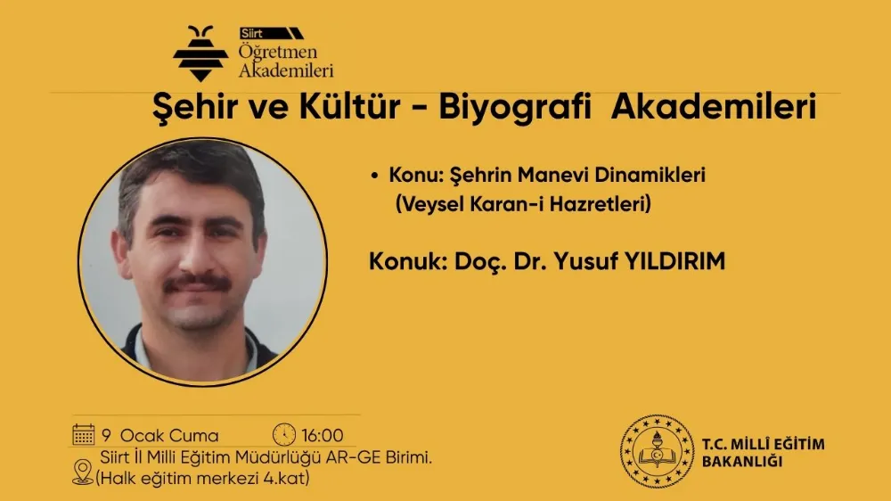 Programda, Siirt’in manevi kimliğinin oluşumunda önemli bir yere sahip olan Veysel Karani Hazretleri üzerinden; şehir, kültür, inanç ve toplumsal hafıza ilişkisi ele alınacak. Akademik çerçevede gerçekleştirilecek sunumun, öğretmenlerin şehir kültürü ve yerel değerler konusundaki birikimlerine katkı sunması hedefleniyor.