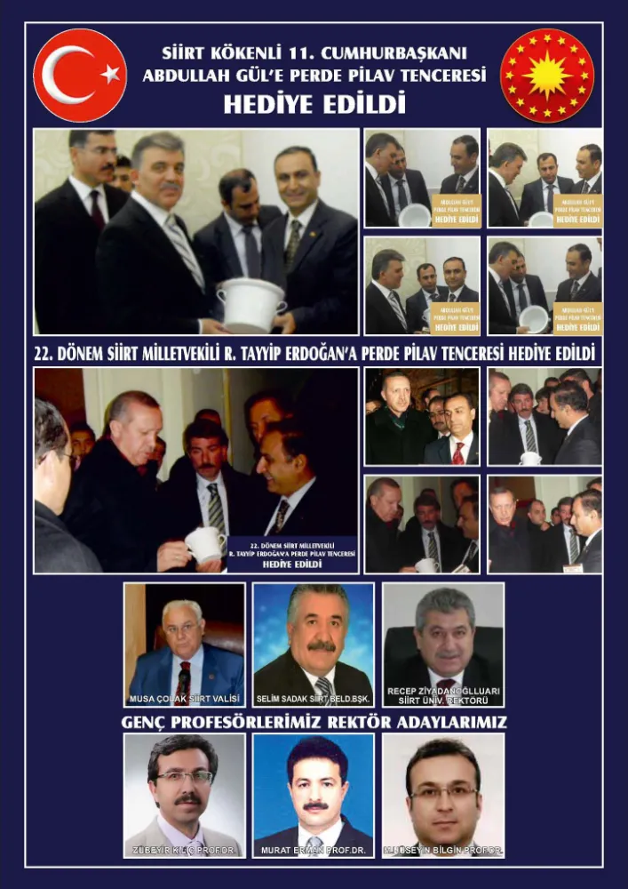 Kitapta, Türkiye protokolünde yer alan Siirtli isimlere yapılan anlamlı ziyaretler ve hediye takdimleri de geniş yer buluyor. Özellikle Siirt kültürünün simgelerinden biri olan Perde Pilav Tenceresi, yıllar boyunca devlet büyüklerine takdim edilerek şehrin kültürel kimliğinin bir nişanesi olarak sunuldu.