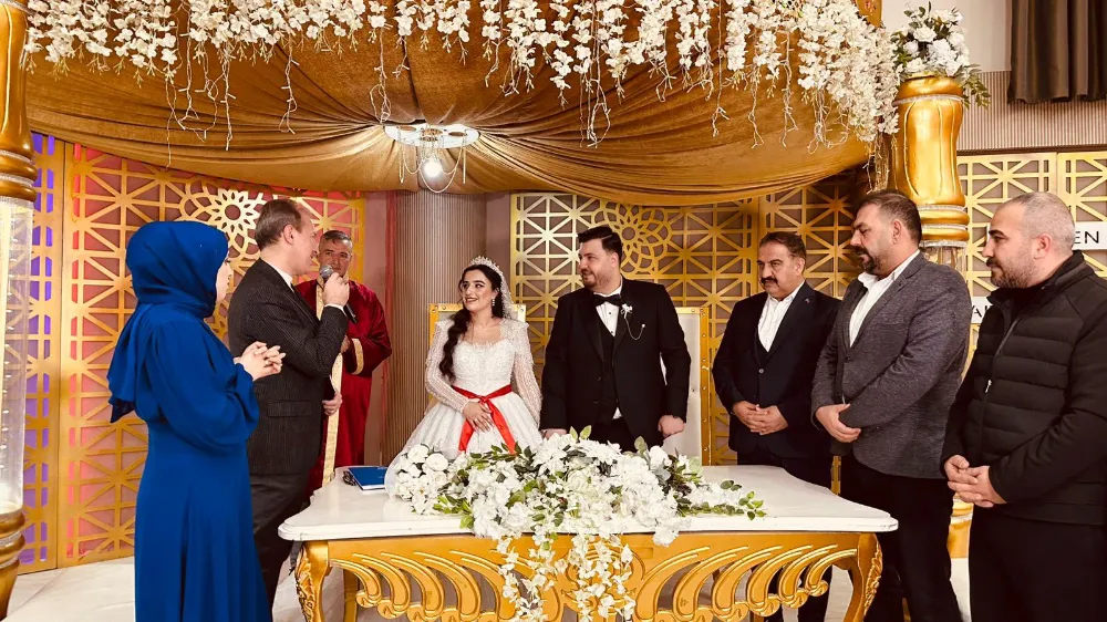 Düğün töreni, ailelerin yakınları ve davetlilerin katılımıyla sıcak ve samimi bir atmosferde gerçekleşirken, nikâh merasiminde birlik, beraberlik ve aile kurumunun önemine vurgu yapıldı.