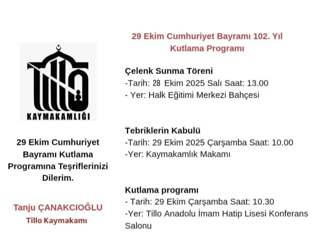 Cumhuriyetimizin ilanının 102. yılı tüm yurtta olduğu gibi Tillo’da da büyük bir gurur ve coşkuyla kutlanacak. Tillo Kaymakamlığı tarafından hazırlanan program kapsamında, ilçede bayram heyecanı erken başlayacak.