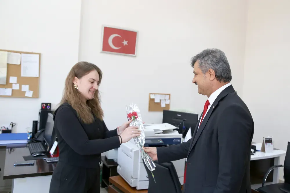 Rektörlük bünyesinde düzenlenen programda, üniversitenin farklı birimlerinde çalışan kadın personellere kırmızı karanfil dağıtılarak Kadınlar Günü kutlandı.
