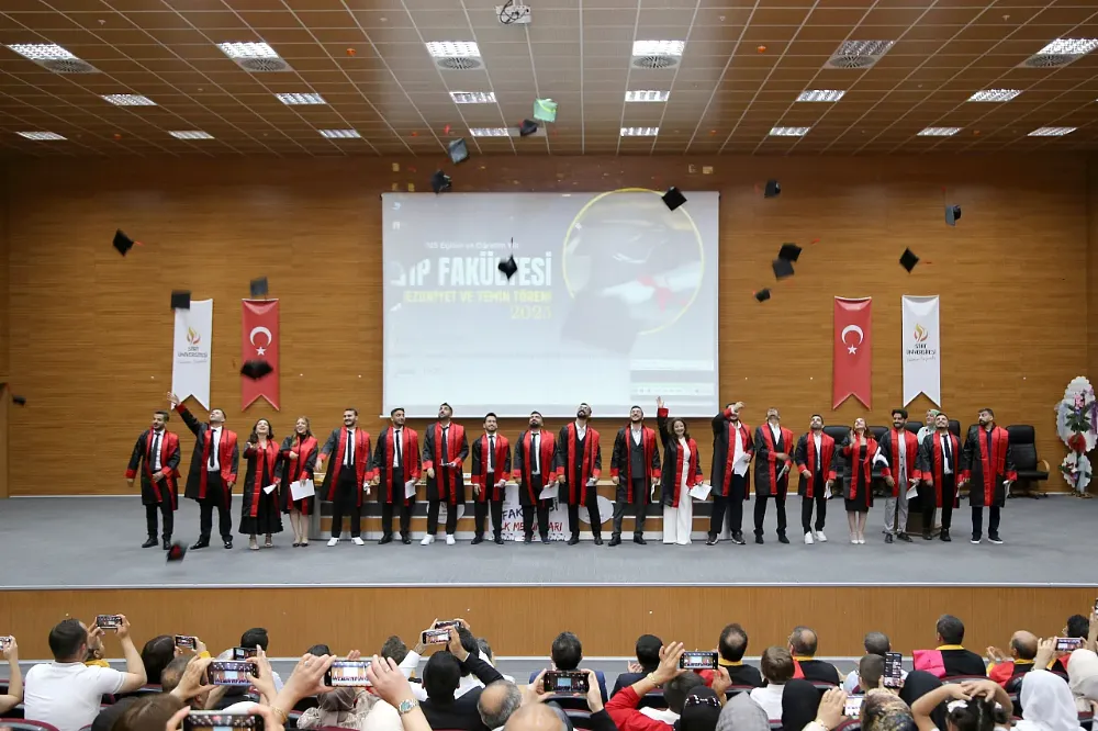 Öğrencilerin hazırladığı video gösterimi, cübbe giyme, temsili diploma takdimi ve hediye sunumlarıyla devam eden programda, ilk mezunlar Hipokrat Yemini ederek keplerini havaya fırlattı.