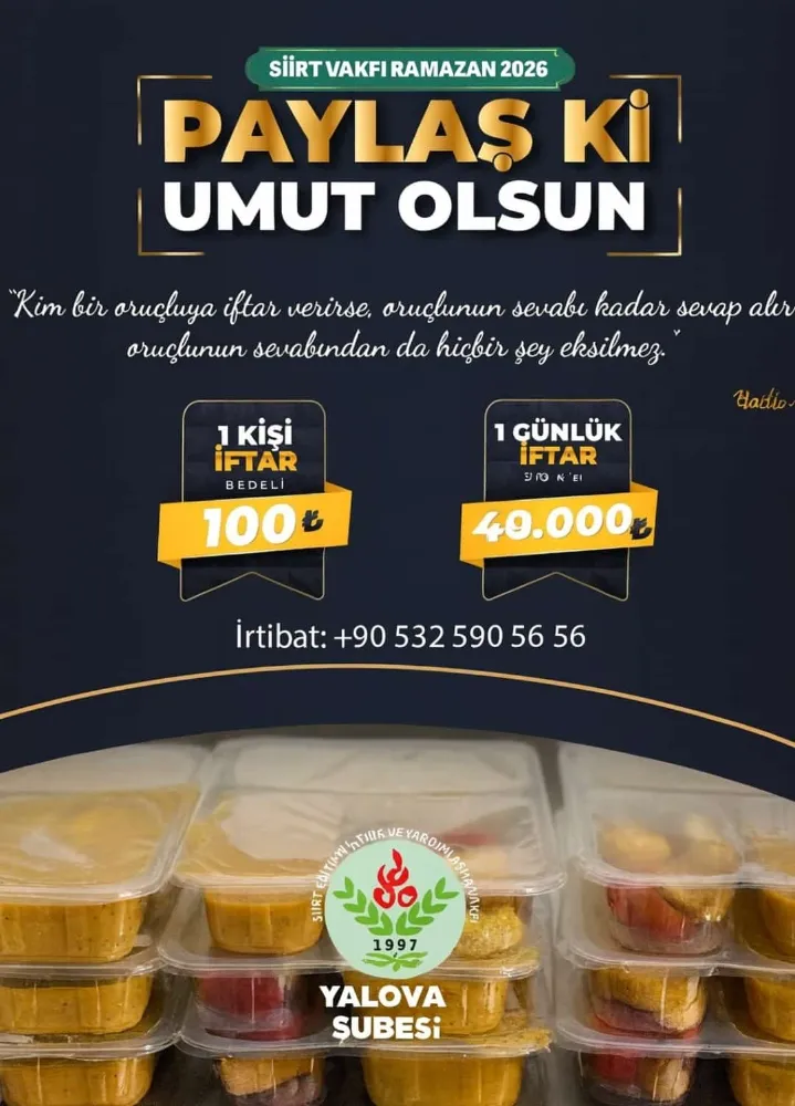Organizasyonun sahadaki uygulamasının Siirt Vakfı Yalova Şubesi koordinasyonunda yürütüleceği belirtilirken, iftarların hijyenik koşullarda hazırlanarak ihtiyaç sahiplerine ulaştırılacağı ifade edildi.