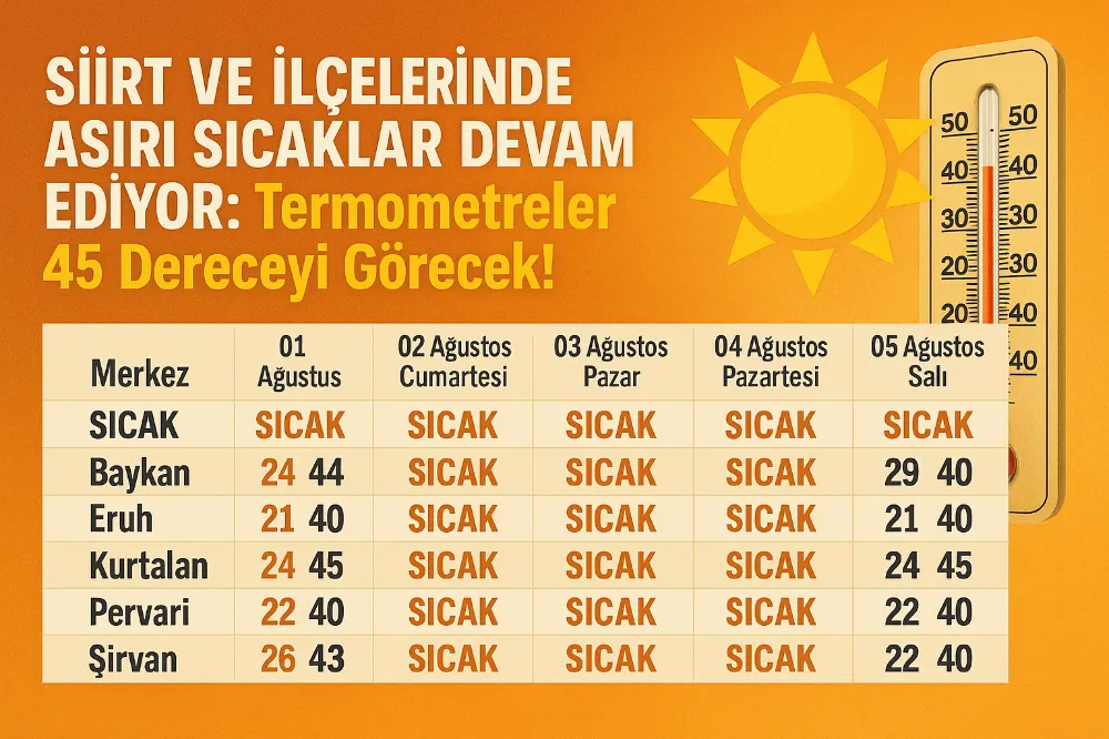 Meteoroloji Genel Müdürlüğü'nün verilerine göre, Siirt ve ilçelerinde önümüzdeki 5 gün boyunca aşırı sıcak hava etkili olacak. Vatandaşlar, özellikle öğle saatlerinde mecbur kalmadıkça dışarı çıkmamaları konusunda uyarıldı.