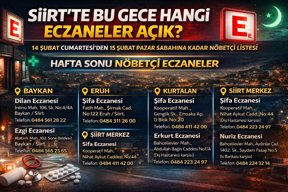 Siirt merkez ve tüm ilçelerinde 14 Şubat Cumartesi günü başlayıp 15 Şubat Pazar sabahına kadar hizmet verecek nöbetçi eczaneler açıklandı. Hafta sonu ilaç ihtiyacı olan vatandaşların mağduriyet yaşamaması için il ve ilçe bazlı nöbetçi listesi netleşti.