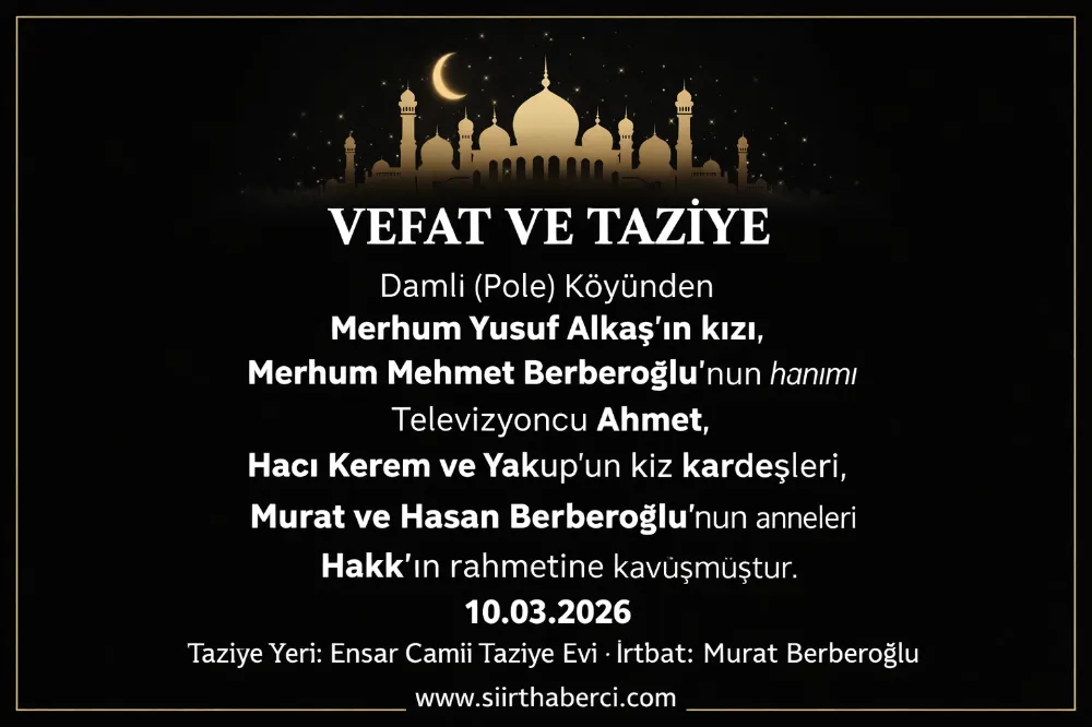 Siirt’te bir vefat haberi daha sevenlerini yasa boğdu. Siirt merkeze bağlı Damlı (Pole) köyü nüfusuna kayıtlı olan merhume, 10 Mart 2026 tarihinde Hakk’ın rahmetine kavuştu.