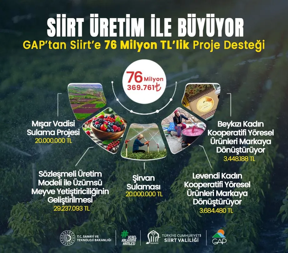 Sanayi ve Teknoloji Bakanlığı GAP Bölge Kalkınma İdaresi Başkanlığı (GAP) tarafından 2026 yılı programı kapsamında Siirt’te uygulanmak üzere tarım, sulama ve yerel üretimi kapsayan projelere toplam 76.369.761 TL destek sağlandı.