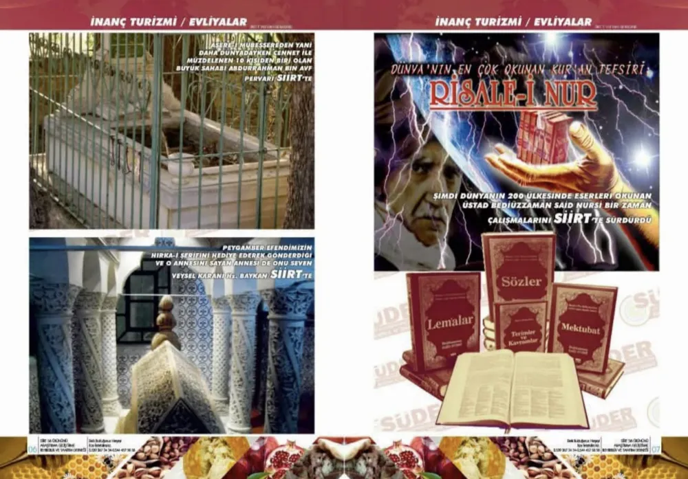Siirt’in asırlara uzanan manevi birikimi, “Dünyada ve Türkiye’de Bulunan Siirtliler” kitabının Evliyalar ve İnanç Turizmi bölümünde iki karşılıklı sayfa halinde okuyuculara sunuluyor.