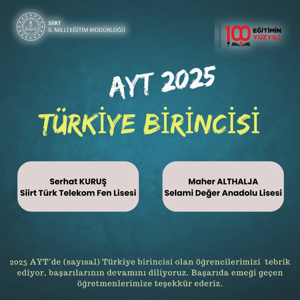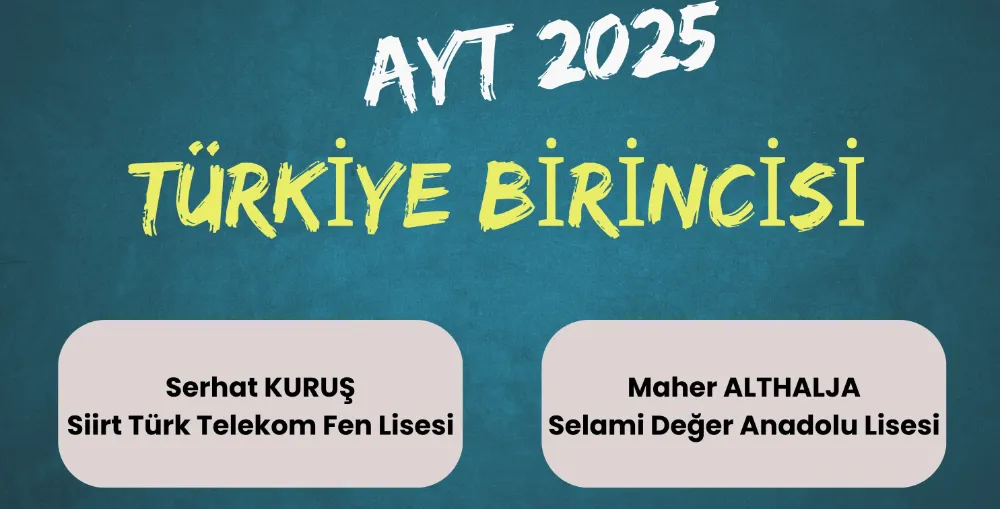 2025 Yükseköğretim Kurumları Sınavı (YKS) kapsamında yapılan Alan Yeterlilik Testi (AYT)'de, sayısal puan türünde tüm soruları doğru yanıtlayan iki Siirtli öğrenci, Türkiye birincisi olma başarısı gösterdi.