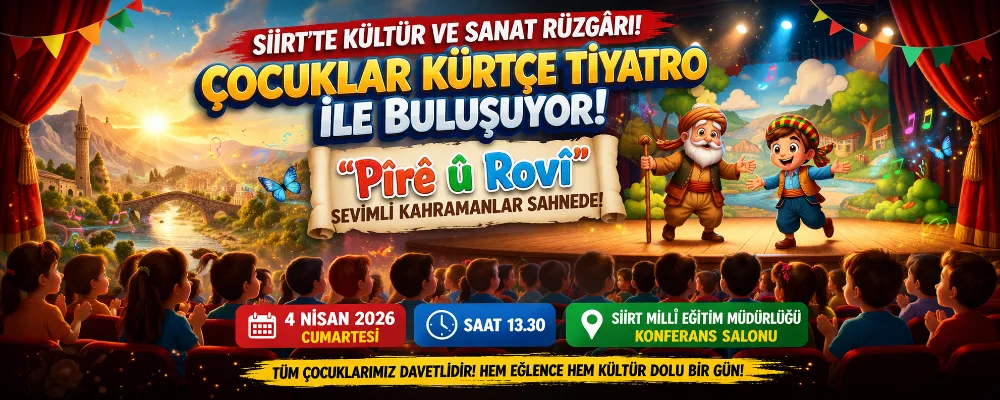 Siirt’te çocukların kültürel gelişimine katkı sunacak önemli bir etkinlik daha hayata geçiriliyor. Eğitim Sen Siirt Şubesi tarafından organize edilen program kapsamında, çocuklara yönelik Kürtçe tiyatro oyunu “Pîrê û Rovî” sahnelenecek.