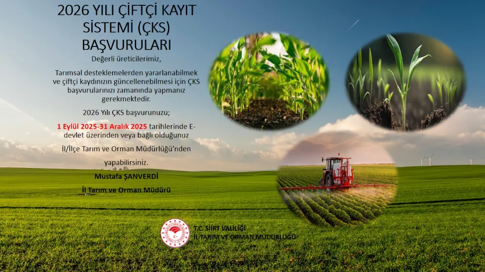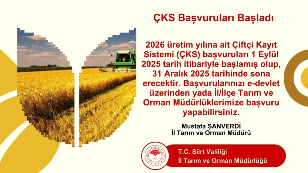 Siirt İl Tarım ve Orman Müdürlüğü, 2026 üretim yılına ait Çiftçi Kayıt Sistemi (ÇKS) başvurularının 1 Eylül 2025 itibariyle başladığını duyurdu.