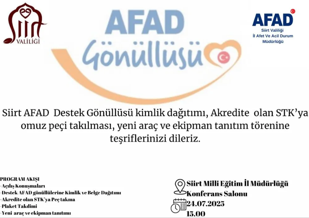 Siirt Valiliği ve AFAD İl Müdürlüğü koordinasyonunda, AFAD Destek Gönüllülerine yönelik önemli bir tören gerçekleştirilecek. Siirt AFAD Destek Gönüllüsü kimlik dağıtımı, akredite olan sivil toplum kuruluşlarına (STK) omuz peçi takılması, yeni araç ve ekipmanların tanıtımının yapılacağı törene tüm halk davet edildi.