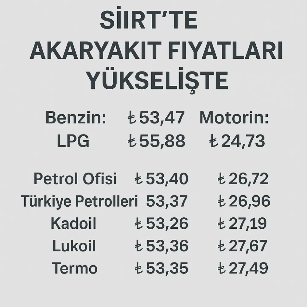 Siirt'te 27 Temmuz 2025 itibarıyla benzin ve motorin fiyatları yüksek seviyelerde seyrediyor. Ortalama fiyatlar şu şekilde: