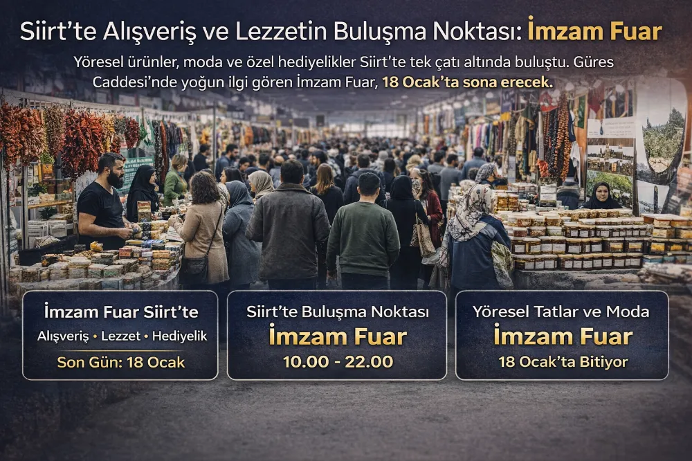 Siirt’te alışveriş ve lezzeti bir arada yaşamak isteyenler için İmzam Fuar, 18 Ocak’ta sona erecek. Organizasyon yetkilileri, fuarın bitimine kadar tüm Siirt halkını fuar alanına davet ediyor