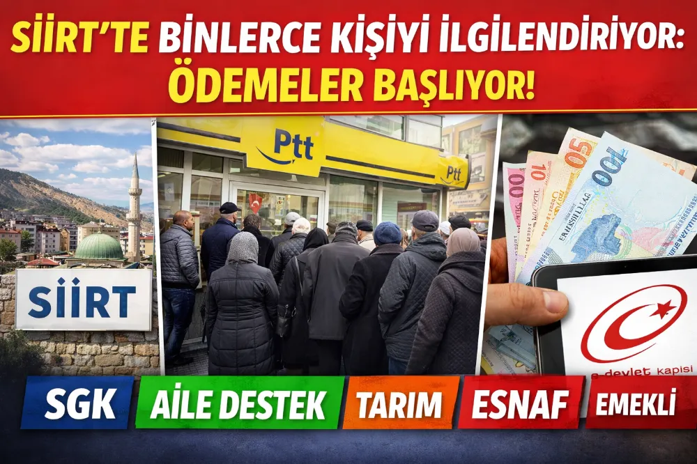 Siirt’te SGK, aile destekleri, tarım ödemeleri, esnaf ve emekli başlıklarında geniş kapsamlı bir ödeme süreci başlıyor. Detaylar netleştikçe ödemelerin tarih ve kapsamına ilişkin bilgilendirmelerin kamuoyuyla paylaşılması bekleniyor.