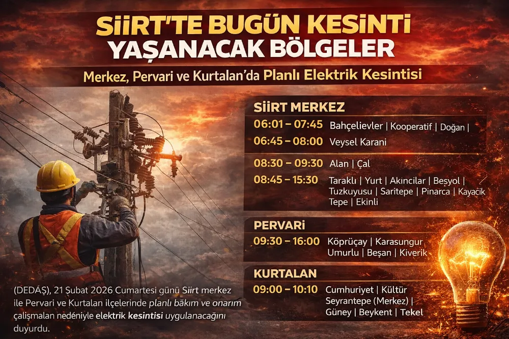 Dicle Elektrik Dağıtım A.Ş. (DEDAŞ), 21 Şubat 2026 Cumartesi günü Siirt merkez ile Pervari ve Kurtalan ilçelerinde planlı bakım ve onarım çalışmaları nedeniyle elektrik kesintisi uygulanacağını duyurdu.