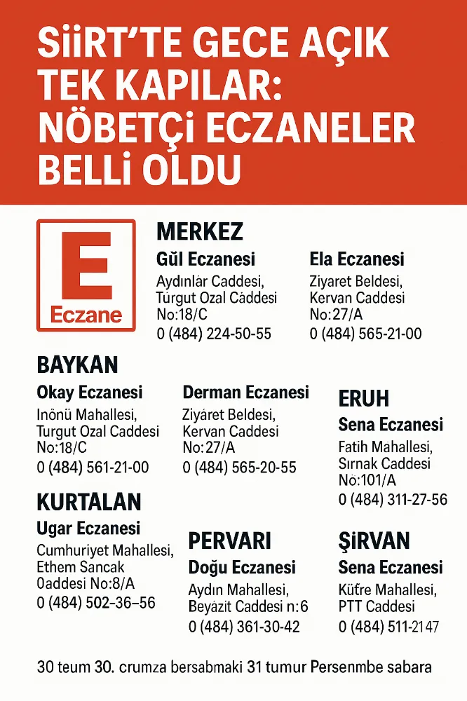 Siirt İl Sağlık Müdürlüğü’nün açıkladığı resmi verilere göre, hem merkezde hem de ilçelerde vatandaşlara kesintisiz hizmet sunacak nöbetçi eczanelerin listesi şu şekilde: