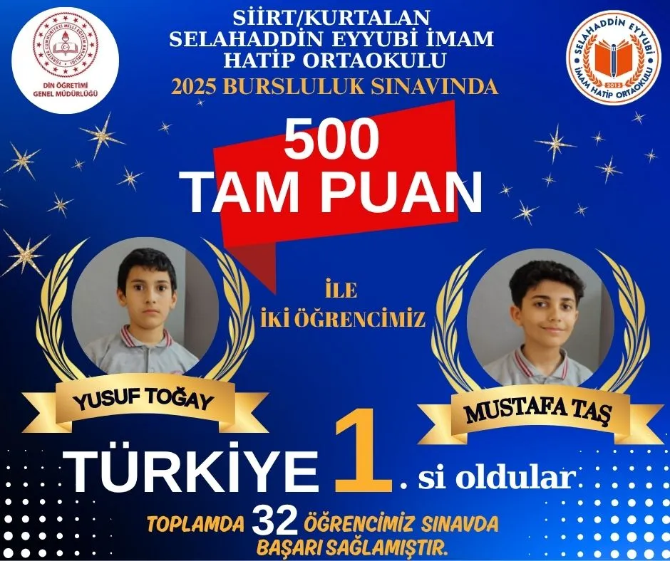 Kurtalan Selahaddin Eyyubi İmam Hatip Ortaokulu öğrencileri Yusuf Toğay ve Mustafa Taş, 2025 Bursluluk Sınavı’nda 500 tam puan alarak Türkiye genelinde birinci olmayı başardı. Aynı sınavda okuldan toplam 32 öğrenci başarı gösterdi. Bu büyük başarının arkasında, okul müdürü Murat Bayrak, müdür yardımcıları, rehberlik birimi ve branş öğretmenlerinin disiplinli ve özverili çalışmaları yer aldı.