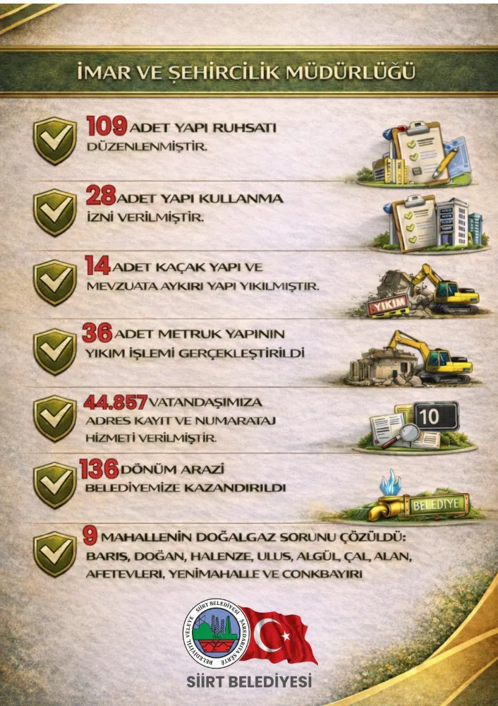 Ortaya konulan tablo, Siirt’te imar uygulamalarının rastgele değil; hukuk, planlama ve kamu yararı ekseninde yürütüldüğünü gösteriyor. Kaçak yapıyla mücadele, metruk yapıların temizlenmesi ve ruhsatlı yapılaşmanın teşvikiyle Siirt, daha düzenli ve güvenli bir kent kimliğine doğru ilerliyor.