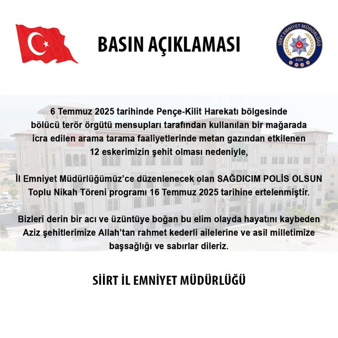 “6 Temmuz 2025 tarihinde Pençe-Kilit Harekâtı bölgesinde, bölücü terör örgütü mensuplarınca kullanılan bir mağarada yürütülen arama-tarama faaliyeti sırasında metan gazına maruz kalan 12 kahraman Mehmetçiğimizin şehit düşmesi sebebiyle, 9 Temmuz’da gerçekleştirilmesi planlanan ‘Sağdıcım Polis Olsun Toplu Nikah Töreni’ 16 Temmuz 2025 tarihine ertelenmiştir.”