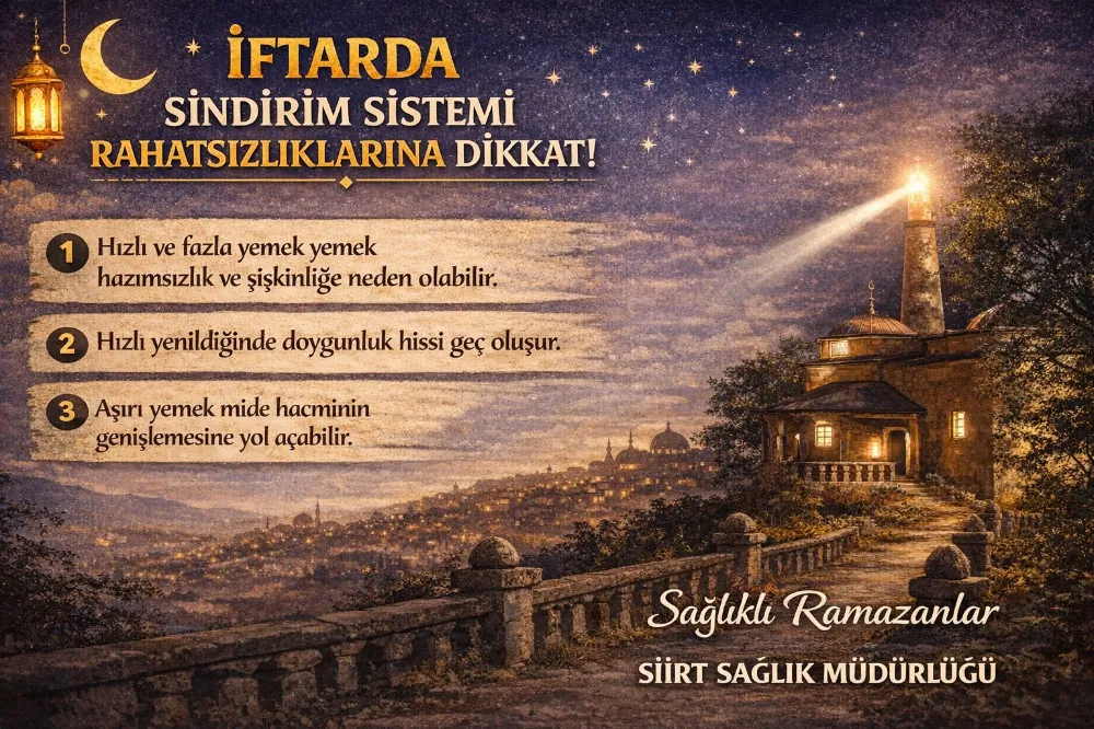 Ramazan ayının başlamasıyla birlikte Siirt’te iftar sofraları bereketle kurulurken, sağlık uzmanlarından da önemli uyarılar geldi. Uzun süren açlığın ardından hızlı ve kontrolsüz şekilde yemek tüketilmesinin sindirim sistemi üzerinde ciddi sorunlara yol açabileceği belirtildi.