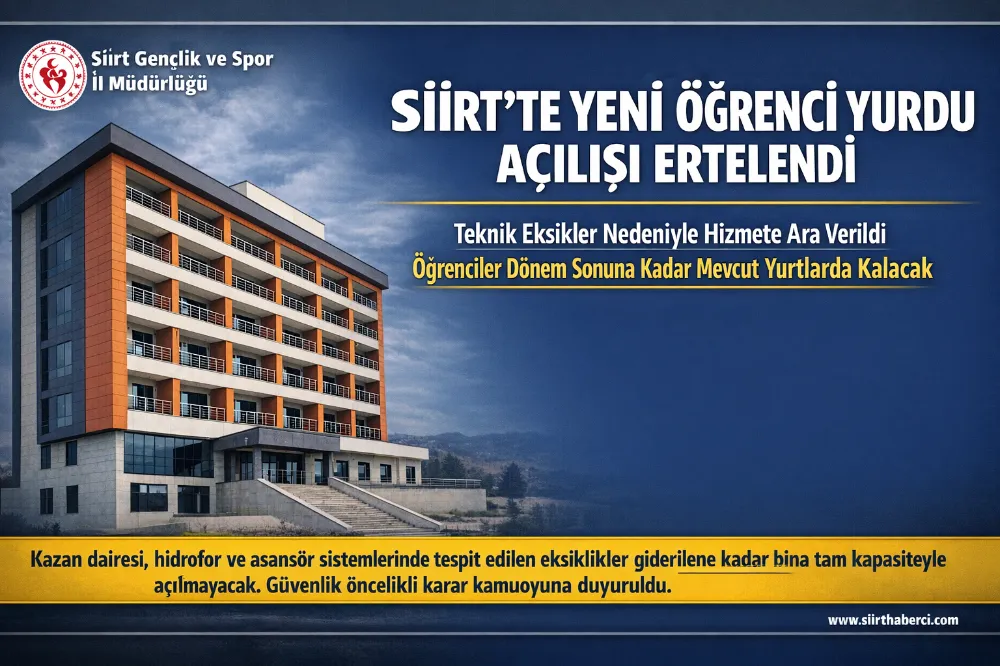 Alınan bu karar, özellikle üniversite öğrencilerinin barınma güvenliği açısından yerinde ve sorumlu bir adım olarak değerlendiriliyor. Eğitim hayatlarının en kritik dönemlerinden birini yaşayan gençlerin, teknik riskler giderilmeden yeni binaya yerleştirilmemesi kamuoyunda da olumlu karşılandı.Siirt Gençlik ve Spor İl Müdürlüğü tarafından yapılan resmi açıklamaya göre, teknik eksiklikler nedeniyle yurdun tam kapasiteyle hizmete açılması ertelendi.