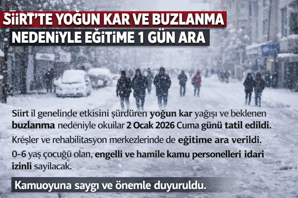 Bu kapsamda, 2 Ocak 2026 Cuma günü, Siirt il genelinde resmî ve özel tüm eğitim kurumları, özel kreşler, gündüz bakımevleri ile rehabilitasyon merkezlerinde eğitime 1 (bir) gün süreyle ara verilmesi kararlaştırıldı.