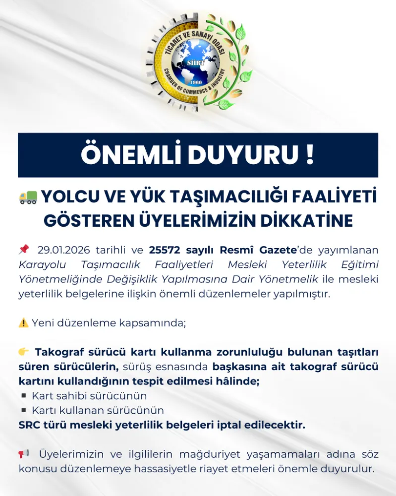Siirt Ticaret ve Sanayi Odası (STSO), yolcu ve yük taşımacılığı faaliyeti yürüten üyelerini yakından ilgilendiren önemli bir düzenlemeye ilişkin kamuoyunu bilgilendirdi.