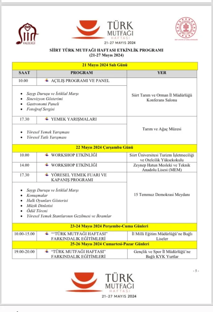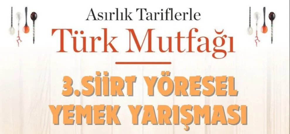 On iki bin yıllık tarihi geçmişiyle üzerinde bulunduğu coğrafyada yaşayan birçok medeniyetin ve uygarlığın beşiği olan Siirt yöresel mutfağı, orijinal, benzersiz ve kendine has özellikleri bulunan zengin mutfağının tanıtılması amacıyla “Türk Mutfağı Haftası” etkinlikleri kapsamında Siirt Valiliği himayelerinde İl Kültür ve Turizm Müdürlüğününce 21 Mayıs 2024 Salı günü Saat 17.30’da Siirt Tarım ve Ağaç Müzesi’nde ödüllü “3. Siirt Yöresel Yemek &Tatlı Yarışması” yapılacak.