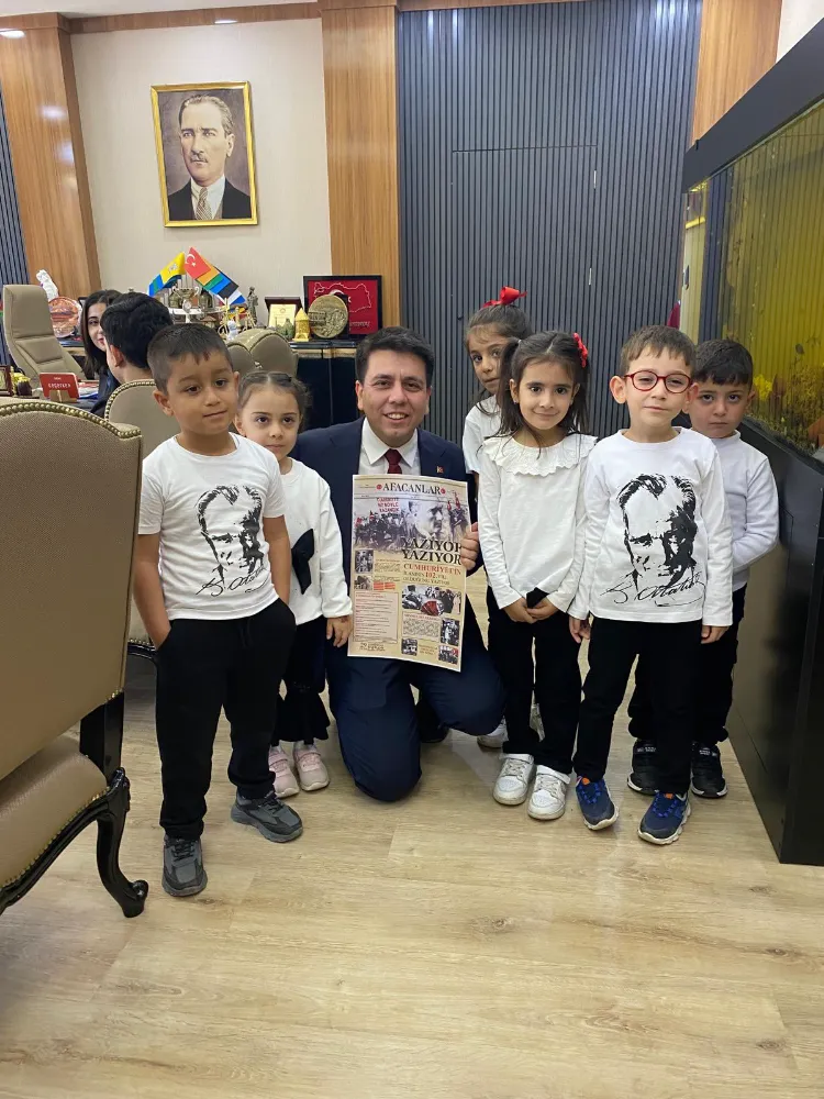 Siirt’in Şirvan ilçesinde eğitim gören Afacanlar Anaokulu öğrencileri, 29 Ekim Cumhuriyet Bayramı dolayısıyla Şirvan Kaymakamı Ahmet Ali Altıntaş’ı makamında ziyaret etti.