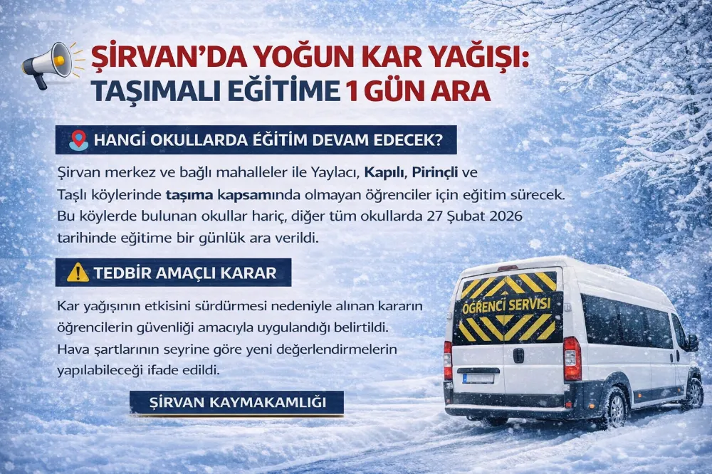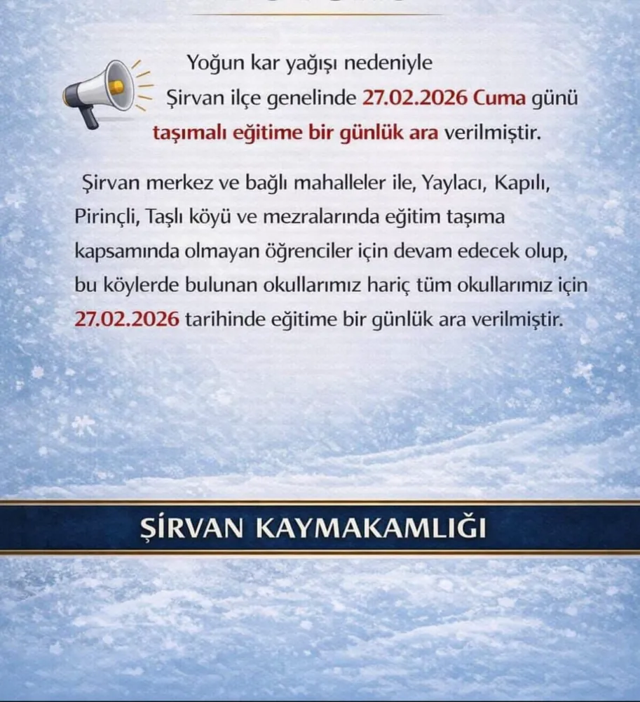 Şirvan merkez ve bağlı mahalleler ile Yaylacı, Kapılı, Pirinçli ve Taşlı köylerinde taşıma kapsamında olmayan öğrenciler için eğitim faaliyetlerinin devam edeceği bildirildi. Bu köylerde bulunan okullar hariç olmak üzere, diğer tüm okullarda 27 Şubat 2026 tarihinde eğitime bir günlük ara verildiği duyuruldu.