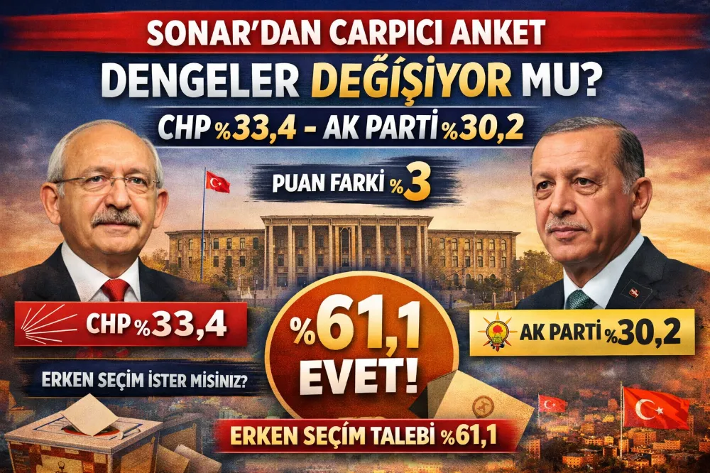 SONAR’ın son anketi, CHP’nin oy oranını artırdığını, AK Parti ile farkın daraldığını ve toplumda erken seçim beklentisinin güçlü biçimde yükseldiğini ortaya koyuyor. Bu sonuçlar, önümüzdeki dönemde siyasi gündemin daha da hareketleneceğine işaret ediyor.