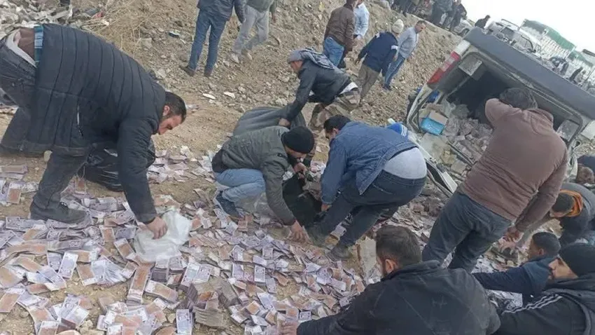 Suriye Merkez Bankası’nın Rusya’da bastırılan yeni banknotlarını taşıyan aracın, lastik patlaması sonucu kontrolden çıkarak devrildiği öğrenildi. Kazanın şiddetiyle aracın içindeki para balyaları yola saçıldı ve kısa sürede olay yerine toplanan halk, yere düşen paraları toplamaya başladı.