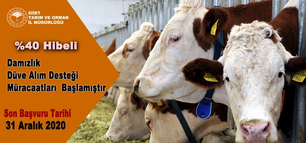 05 Kasım 2020 tarihinden önce Siirt Tarım ve Orman İl Müdürlüğü hayvancılık sistemi (TÜRKVET)’e kayıtlı sığır işletmesi olan ve kapasitesi talep edilen hayvan sayısı ile uyumlu olan yetiştiricilere, işletme kapasitesini 20 başa tamamlayacak şekilde en az 1 baş, en çok 20 baş düve olmak üzere Bakanlıkça belirlenen düve alım bedelinin %40'ı hibe olarak verilecektir.