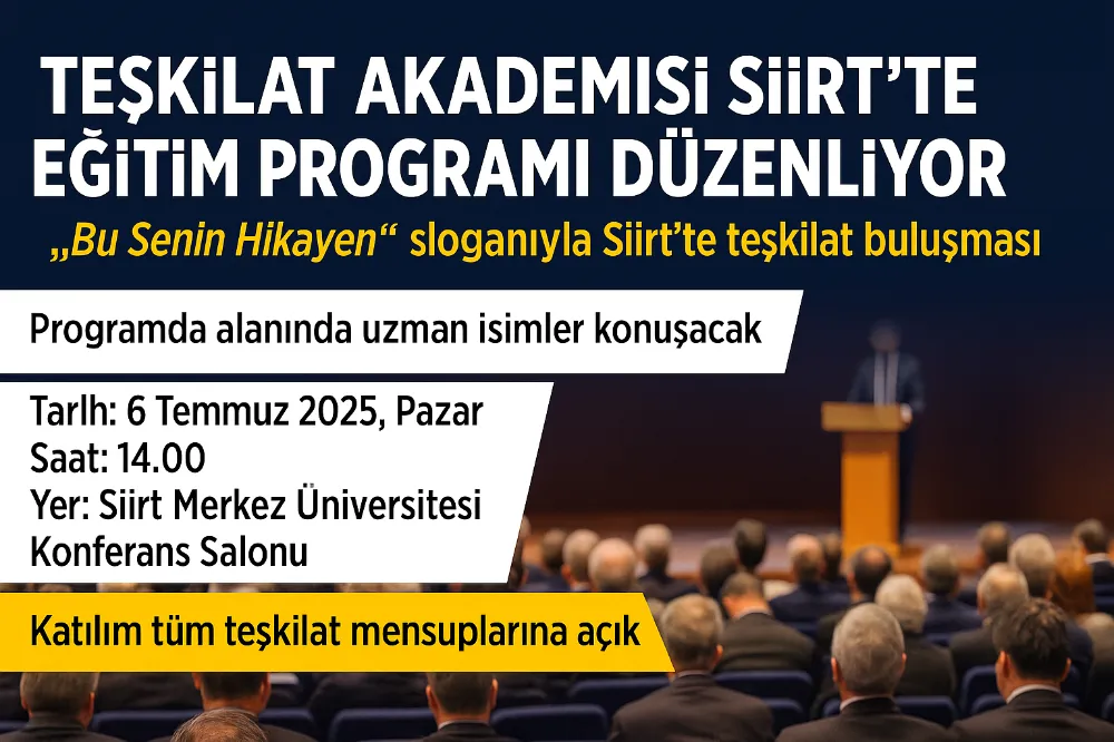 AK Parti Genel Merkez Ar-Ge ve Eğitim Başkanlığı tarafından organize edilen Teşkilat Akademisi Eğitim Programı, 6 Temmuz 2025 Pazar günü Siirt Merkez Üniversitesi Konferans Salonunda gerçekleştirilecek. “Bu Senin Hikayen” temasıyla düzenlenen programa, tüm teşkilat mensuplarının katılımı bekleniyor.