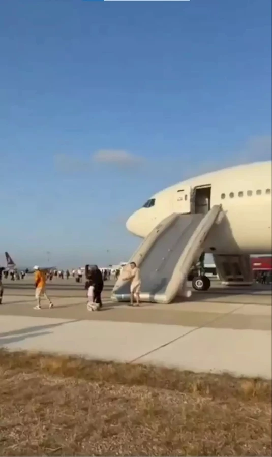 Uçak, Antalya Havalimanı'na iner inmez yolcularını acil tahliye etti. Yolcuların, acil tahliye kaydırağından uçağı terk ettiği görüldü.