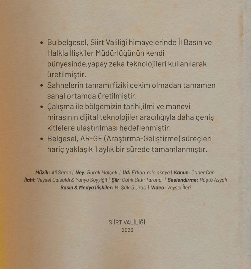 Siirt Valiliği İl Basın ve Halkla İlişkiler Müdürlüğü tarafından tamamen kurum bünyesinde hazırlanan çalışmada, hiçbir fiziksel çekim yapılmadan tüm sahneler dijital ortamda üretildi.