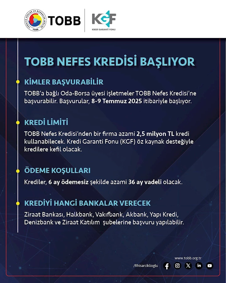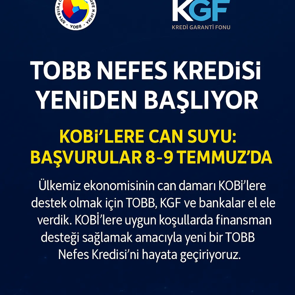 Türkiye Odalar ve Borsalar Birliği (TOBB), Kredi Garanti Fonu (KGF) ve katılımcı bankaların iş birliğiyle KOBİ’lere yönelik yeni bir finansman desteği hayata geçiriliyor. TOBB tarafından kamuoyuna duyurulan Nefes Kredisi Programı, 8-9 Temmuz 2025 tarihleri arasında başvuruya açılıyor.