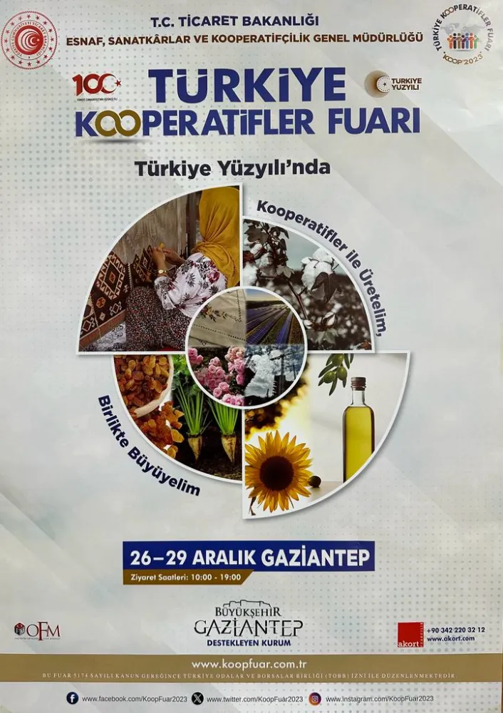 Ülkemizde kooperatifçiliğin geliştirilmesi, kooperatif ürünlerinin tanıtımı ve bu alanda bir farkındalık oluşturularak kooperatifler aracılığıyla iç ve dış ticaretin geliştirilmesi amacıyla Ticaret Bakanlığı tarafından belirli aralıklarla kooperatifler fuarı düzenlenmektedir. Söz konusu fuarın beşincisi Cumhuriyetimizin 100. Yıl kutlamaları çerçevesinde 26-29 Aralık 2023 tarihleri arasında Gaziantep İlinde yer alan Ortadoğu Fuar Merkezinde gerçekleştirilecektir.