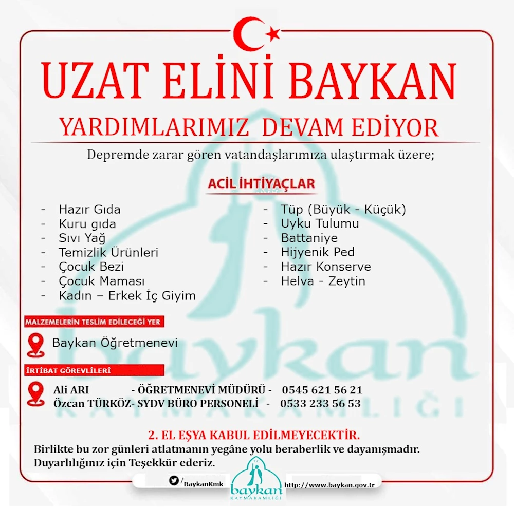 Kaymakam / Belediye Başkanvekili Emin Bağlı; Kampanyaya katılmak isteyen vatandaşlarımız Baykan Öğretmenevi hizmet binasına gelerek müracaat etmeleri yada Öğretmenler evi Müdürü Ali Arı GSM: 0545 621 56 21 veya SYDV personeli Özcan Türköz GSM: 0533 233 56 53 görevli personellerimize ulaşarak katılım sağlayabileceklerini söyledi. Baykan Halkının Deprem felaketinin ilk gününden beri yaraları sarmaya devam ediyor. Kampanyaya katılacak bütün hemşerilerime teşekkür ediyorum dedi.