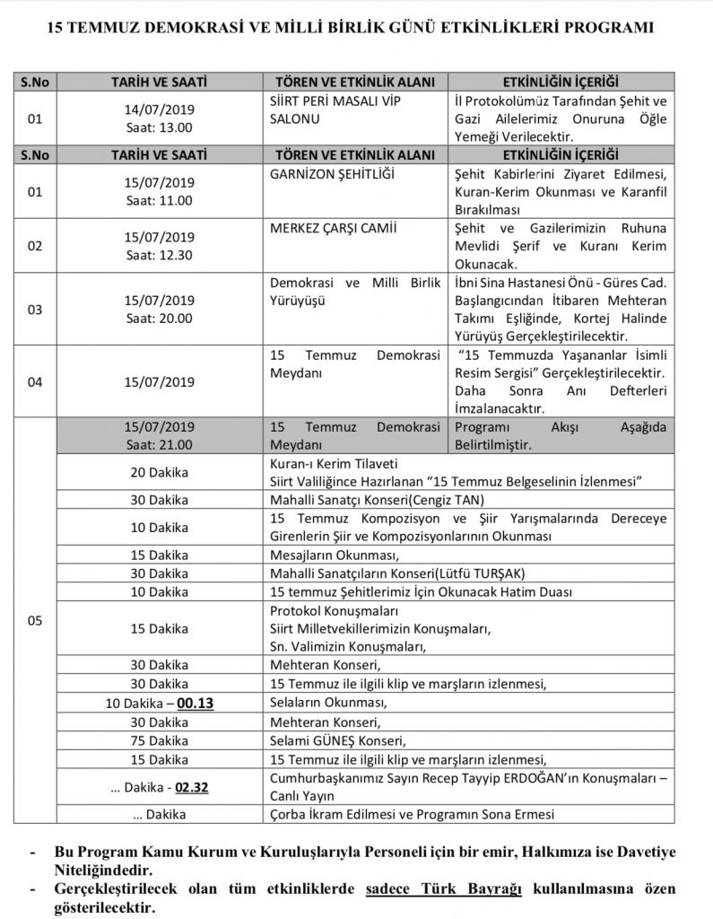 Darbe gecesi canilerin silahlarına ellerini, tanklarına karşı bedenlerini ortaya koyarakcanlarını hiçe sayan Siirt halkı; Valisiyle, Sivil toplum kuruluşlarıyla, basını ile ve toplumun tüm katmanları ile yekvücut olarak, hain darbecilere karşı tarihi bir duruş sergileyerek, en güzel cevabı vermiştir.