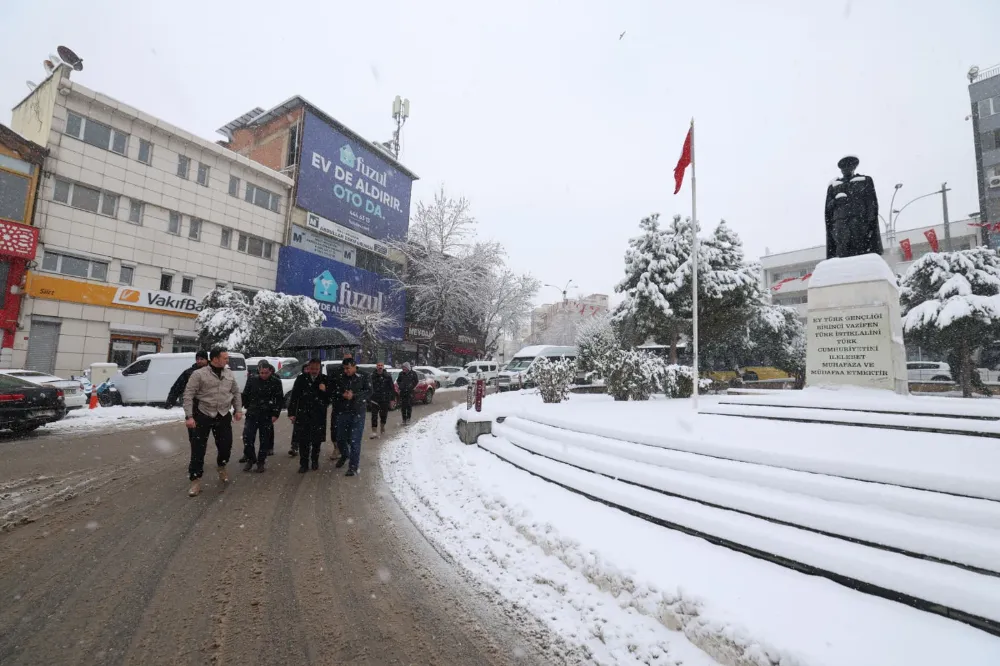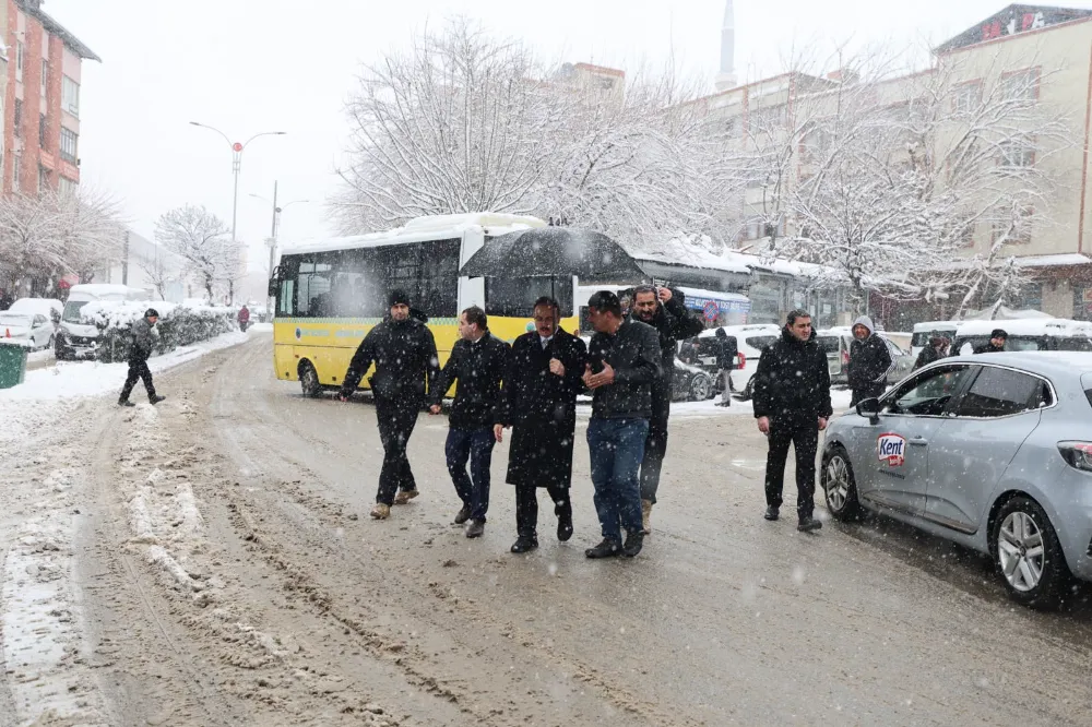 Vali Kızılkaya, yoğun kar yağışına rağmen kent genelinde fedakârca görev yapan belediye ekiplerini sahada ziyaret ederek yürütülen çalışmalara ilişkin bilgi aldı, personele emekleri dolayısıyla teşekkür etti.