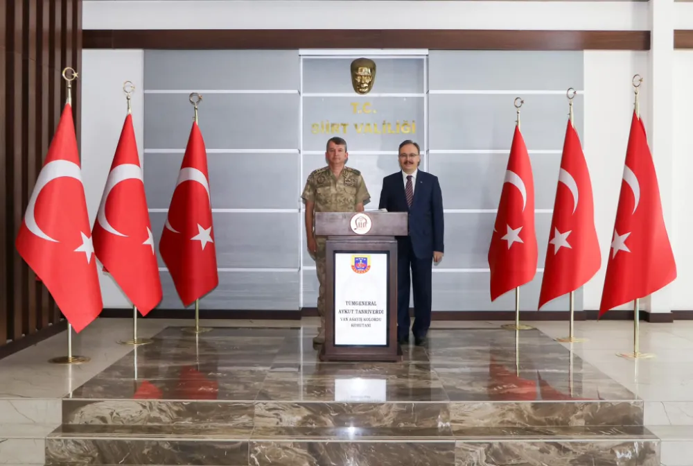 Jandarma Genel Komutan Yardımcılığına terfi eden Van Jandarma Asayiş Kolordu Komutanı Korgeneral Aykut Tanrıverdi Vali Dr. Kemal Kızılkaya’yı ziyaret etti. Jandarma Genel Komutan Yardımcılığı görevine Korgeneral rütbesi ile atanan Van Jandarma Asayiş Kolordu Komutanı Tümgeneral Aykut Tanrıverdi, Vali Dr. Kemal Kızılkaya’ya veda ziyaretinde bulundu. Valilik şeref defterini imzalayan Tanrıverdi, Vali Kızılkaya ile bir süre sohbet etti. Vali Kızılkaya, bölgemizdeki görev süresi boyunca başarılı hizmetlerde bulunan Tümgeneral Tanrıverdi'ye teşekkürlerini iletti. Ziyarette, Siirt İl Jandarma Komutanı Tuğgeneral Emrullah Büyük'te yer aldı.