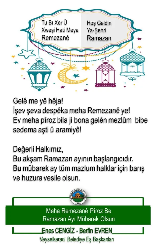 Veysel Karani Belediyesi’nden Ramazan Mesajı: “Meha Remezanê Pîroz Be”