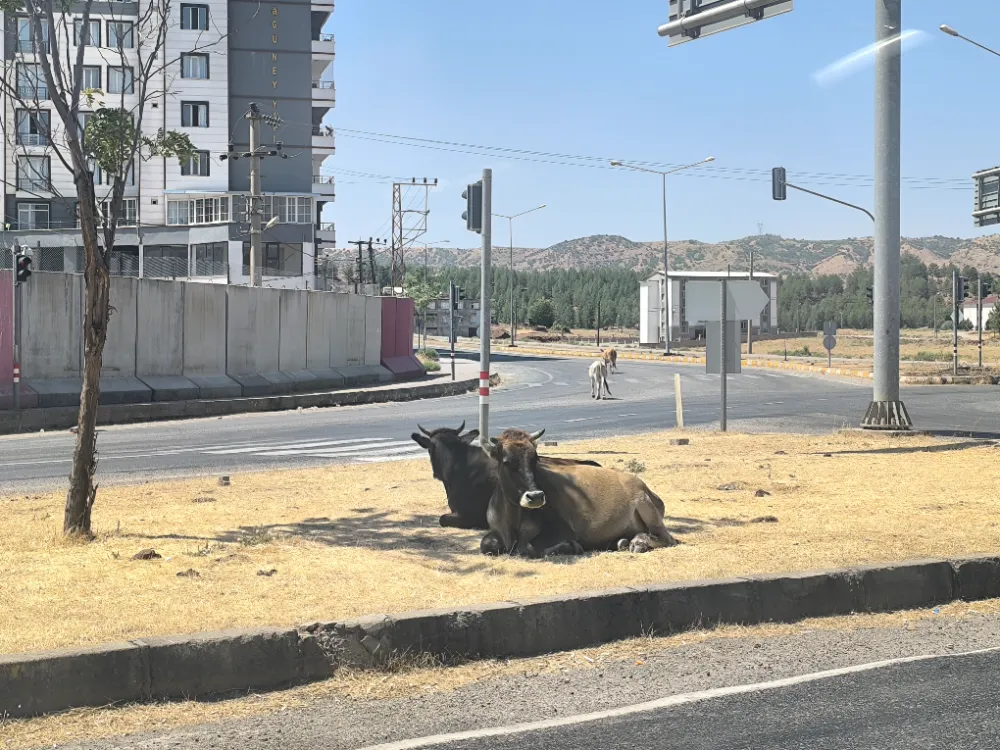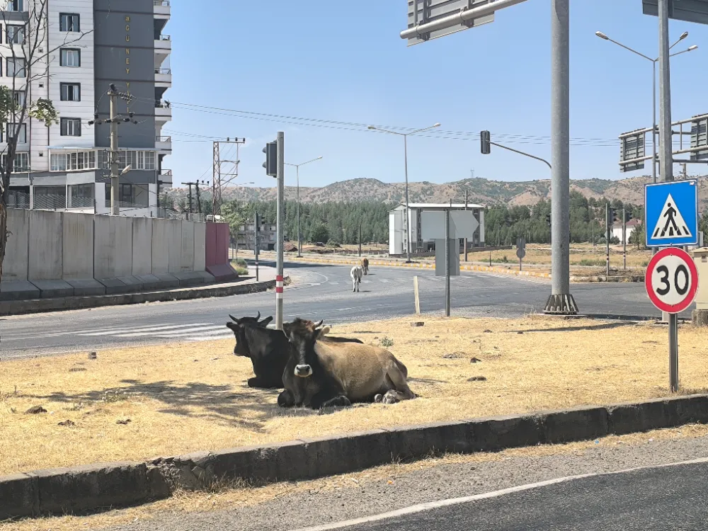 Siirt’in Baykan ilçesine bağlı Veysel Karani Beldesi’nde, şehir içi kavşakta yol kenarına uzanmış halde görülen büyükbaş hayvanlar, hem çevre sakinlerinin hem de sürücülerin tepkisini çekti.