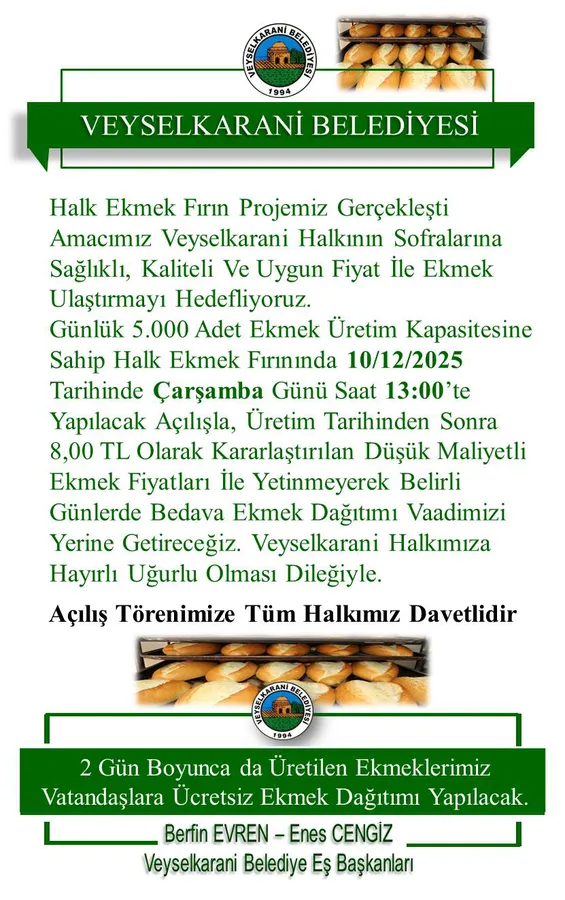 “Bu proje, Veyselkarani halkının yalnız bugününe değil, uzun vadede ekonomik ve sosyal yaşamına katkı sunacak önemli bir adımdır. Amacımız hem uygun fiyatlı ekmek üretmek hem de dayanışma kültürünü güçlendirmektir. Halkımıza hayırlı, uğurlu olsun.”