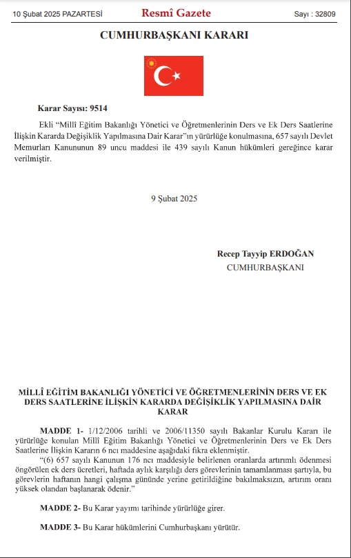 Millî Eğitim Bakanlığı Yönetici ve Öğretmenlerinin Ders ve Ek Ders Saatlerine İlişkin Kararda Değişiklik Yapılmasına Dair Karar (Karar Sayısı: 9514)