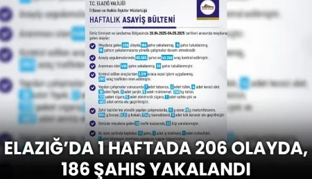 Elazığ Valiliği, son 1 haftalık asayiş verilerini paylaştı. Buna göre son bir hafta içerisinde 206 olay meydana gelirken, 186 şahıs yakalandı ve şahıslardan 9'u tutuklanarak cezaevine gönderildi. Asayiş uygulamalarında 65 bin 585 şahıs ve 40 bin 268 araç kontrol edildi. Aranması olan 458 şahıs yakalanırken, 30 şahıs tutuklanarak cezaevine gönderildi. Kontrol edilen araçlardan 3 bin 319 araca cezai işlem uygulanırken 263 araç trafikten men edildi.