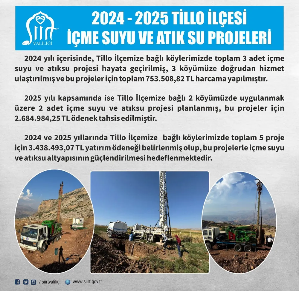 Siirt Valiliği koordinasyonunda, İl Özel İdaresi tarafından kırsalda sağlıklı ve kesintisiz içme suyu temini amacıyla 2024 yılı içinde Tillo ilçemize bağlı köylerde toplam 3 adet içme suyu ve atıksu projesi başarıyla tamamlanmış, 3 köyümüzde vatandaşlarımıza doğrudan hizmet sunulmuştur.