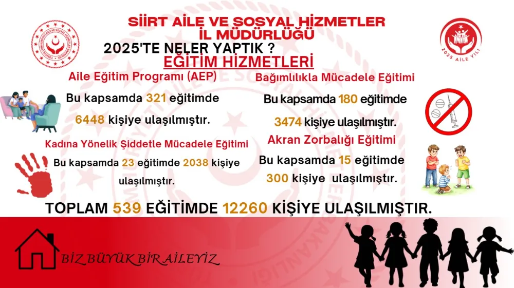2025 yılının “Aile Yılı” ilan edilmesiyle birlikte Siirt Aile ve Sosyal Hizmetler İl Müdürlüğü, aile yapısını güçlendirmek ve toplumsal farkındalığı artırmak amacıyla kent genelinde örnek bir eğitim seferberliği yürüttü. Yıl boyunca gerçekleştirilen çalışmalarla 12 bin 260 vatandaş doğrudan eğitim hizmetlerinden faydalandı.